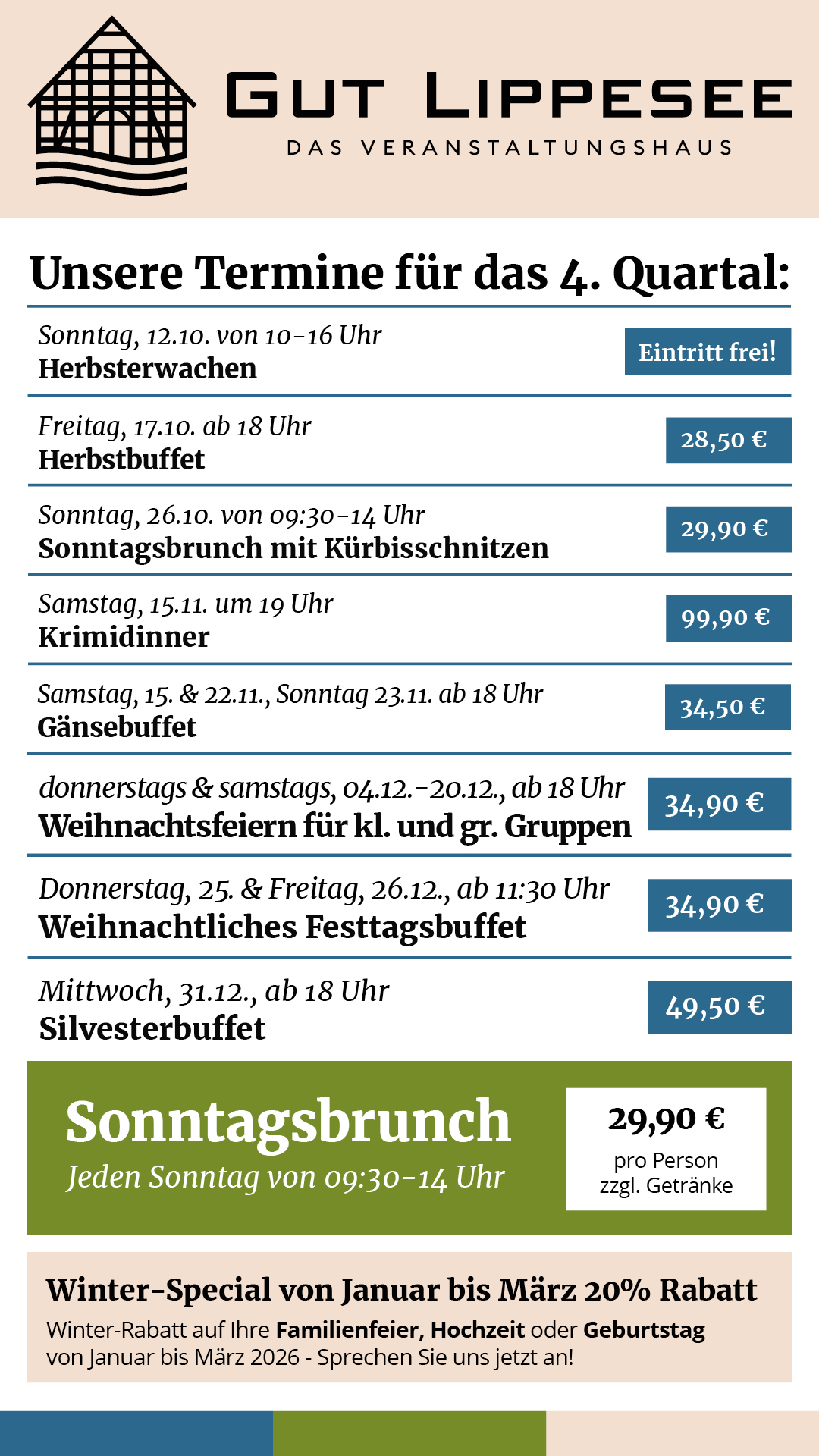 Das historische Gut Lippesee besticht durch seine einzigartigen, individuell gestaltbaren Räumlichkeiten und weitläufigen Außenbereiche direkt am idyllischen Lippesee – ein unvergleichliches Ambiente, das jedes Event zu einem unvergesslichen Erlebnis macht.