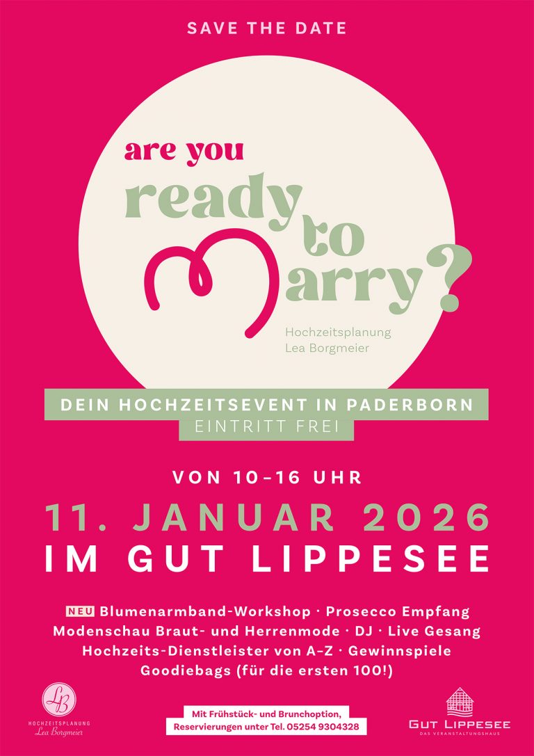 Planen Sie Ihre Hochzeit für 2026 oder 2027 – oder möchten Sie sich einfach inspirieren lassen? Dann laden wir Sie herzlich zu unserer Hochzeitsmesse Ready to Marry auf dem idyllischen Gut Lippesee ein. Am Sonntag, den 11. Januar, von 10:00 bis 16:00 Uhr.