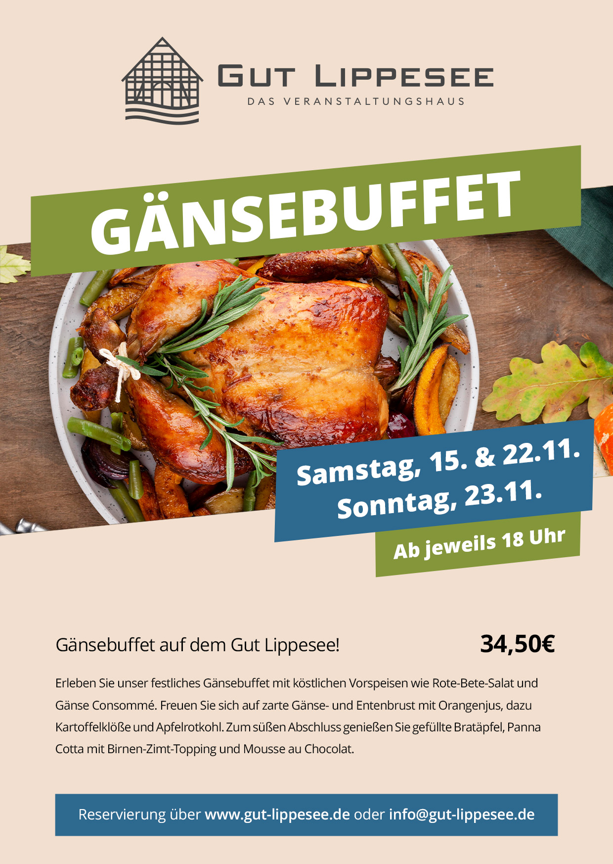Genießen Sie unser Gänse- und Entenbuffet am Samstag, den 15. & 22. November 2025 und Sonntag, den 23. November, jeweils ab 18 Uhr. Für 34,50 € pro Person genießen Sie eine köstliche Auswahl an traditioneller Martinsgans, Ente und herbstlichen Beilagen. Kinder von 0 bis 5 Jahren speisen kostenlos, Kinder von 6 bis 12 Jahren zahlen die Hälfte. Bitte reservieren Sie Ihren Platz über das untenstehende Reservierungsportal – wir freuen uns auf Ihren Besuch!